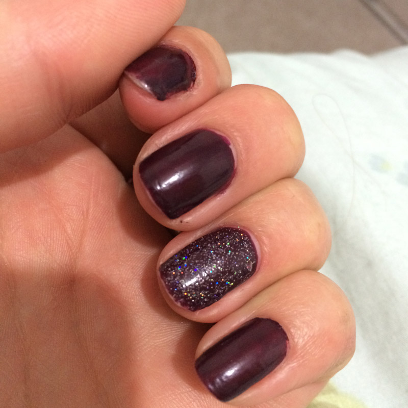 The brush on this is amazing, hands down the best of any brush on any nail polish I’ve tried. The formulation is really glossy, featured here with no top coat (other than an accent topcoat on the ring finger’s of China Glaze’s Fairy Dust). And even better than that is that it stays on for ages without chipping, pictured here after 5 days of wear.